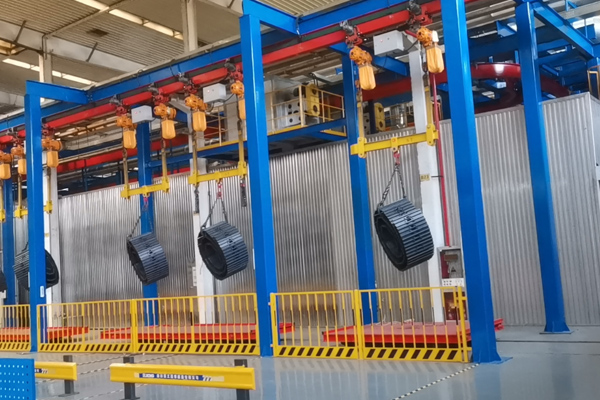 由于懸掛輸送線可在空間上下坡和轉彎,布局方式自用靈活,既充份利用空間,又可以與地面的作業配合進行,因此,廣泛應用于機械、汽車、電子、家用電器、輕工、食品、化工等行業大批量流水生產作業中。