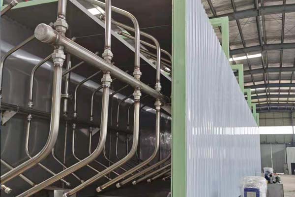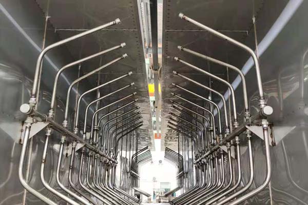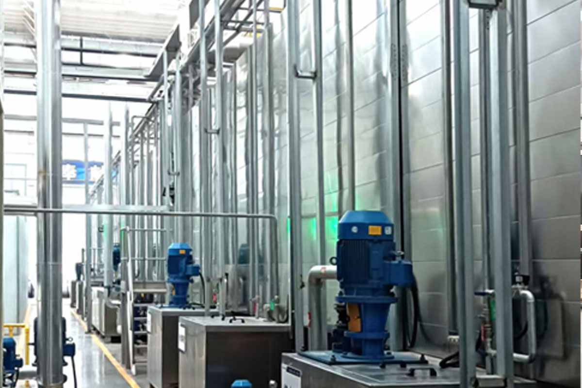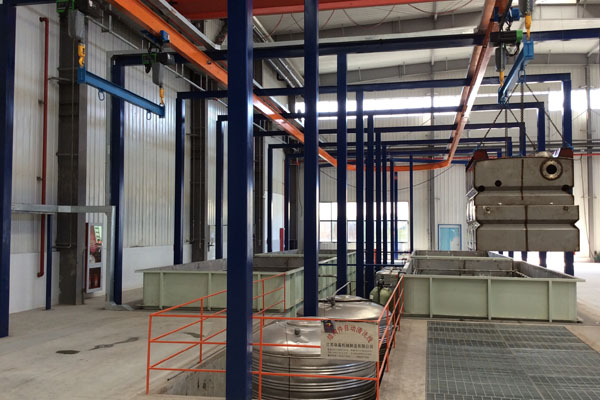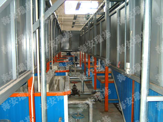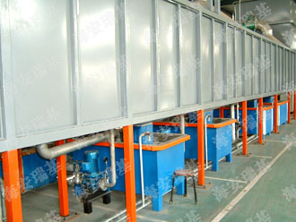 前處理生產(chǎn)線結(jié)構(gòu)特點(diǎn)是:前處理生產(chǎn)線各工序噴淋管布置在隧道內(nèi),噴淋由各液槽的泵來(lái)提供.各工序間都有門洞板隔開,以防竄液.各加熱液槽的加熱形式有槽內(nèi)和槽外。內(nèi)加熱器有排管、蛇形管、波紋板等;外加熱器有列管、板式加熱器等。加熱介質(zhì)有熱水 、蒸汽、導(dǎo)熱油等。在脫脂、磷化工序分別設(shè)有除油系統(tǒng)和除渣系統(tǒng)。為防止各加熱段隧道頂部及門洞處溢出蒸汽,在隧道頂部設(shè)有排風(fēng)機(jī)。
